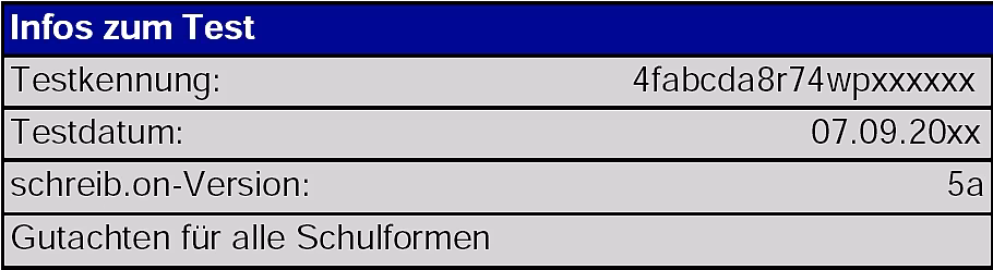 Hier finden Sie Informationen zur verwendeten Testkennung, wann der Test durchgeführt wurde, welche Testversion zum Einsatz gekommen ist und für welche Schulformen dieses Gutachten gültig ist. Bis zum 30.11. des Jahres wird der Test der vorherigen Klassenstufe verwendet.